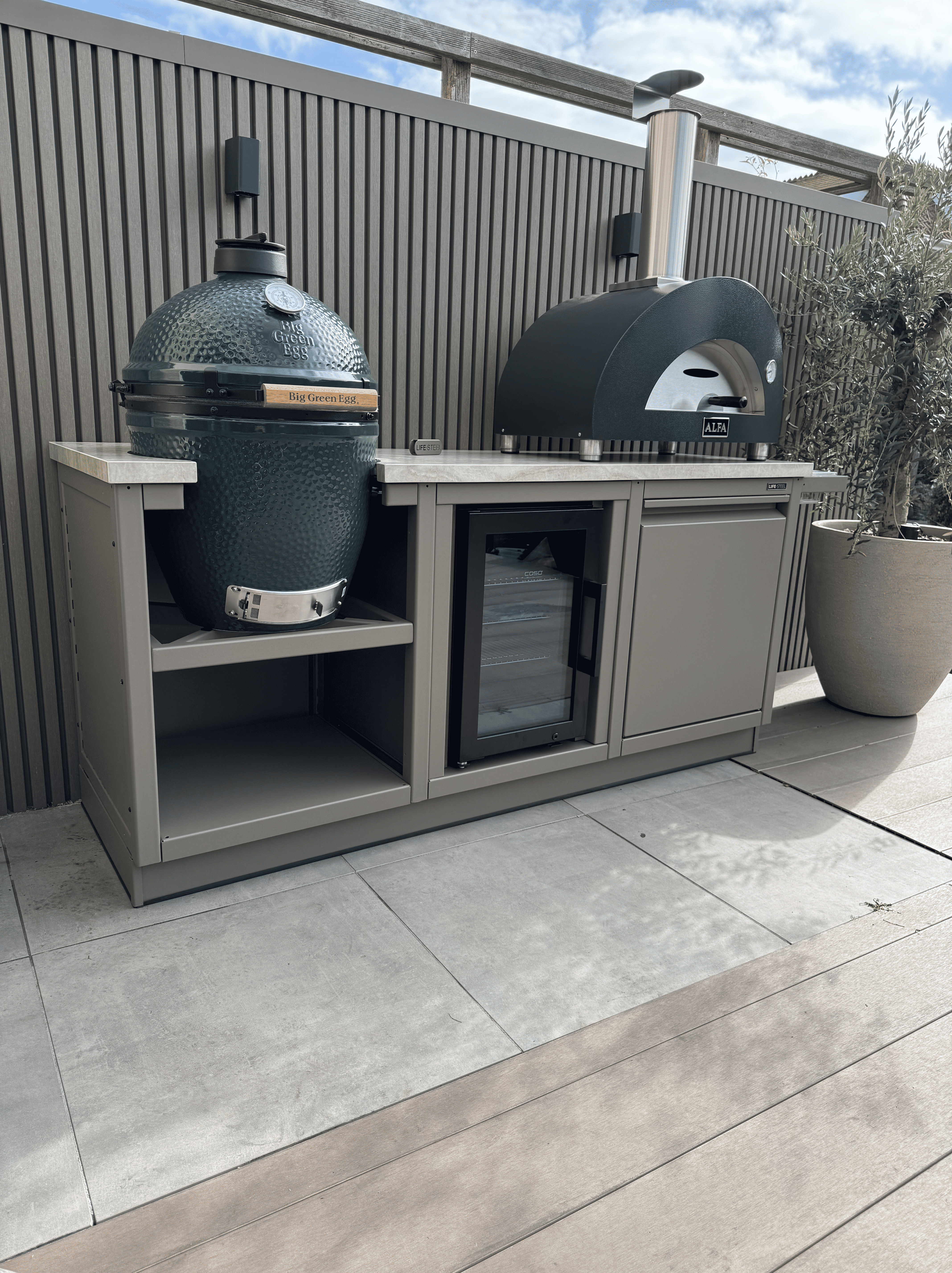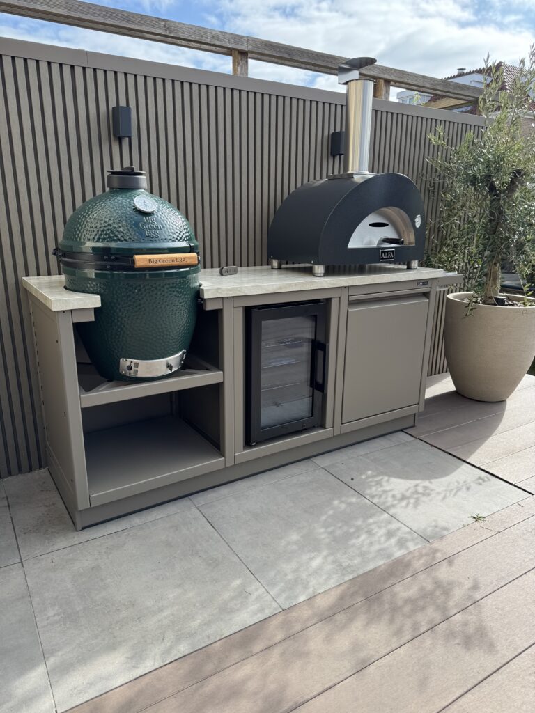 Wat deze buitenkeuken in Nieuwkoop extra bijzonder maakt, is de hoogwaardige kookuitrusting. Zo is er een Green Egg Large Kamado minimalistisch ingebouwd, ideaal om te grillen, slowcooken, roken of bakken. Voor liefhebbers van pizza’s staat er op het werkblad een houtgestookte Alfa Pizzaoven. Binnen slechts 90 seconden komt er een knapperige, authentieke pizza uit de oven – alsof je in Italië aan het water zit.